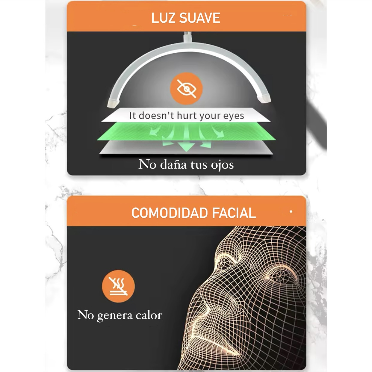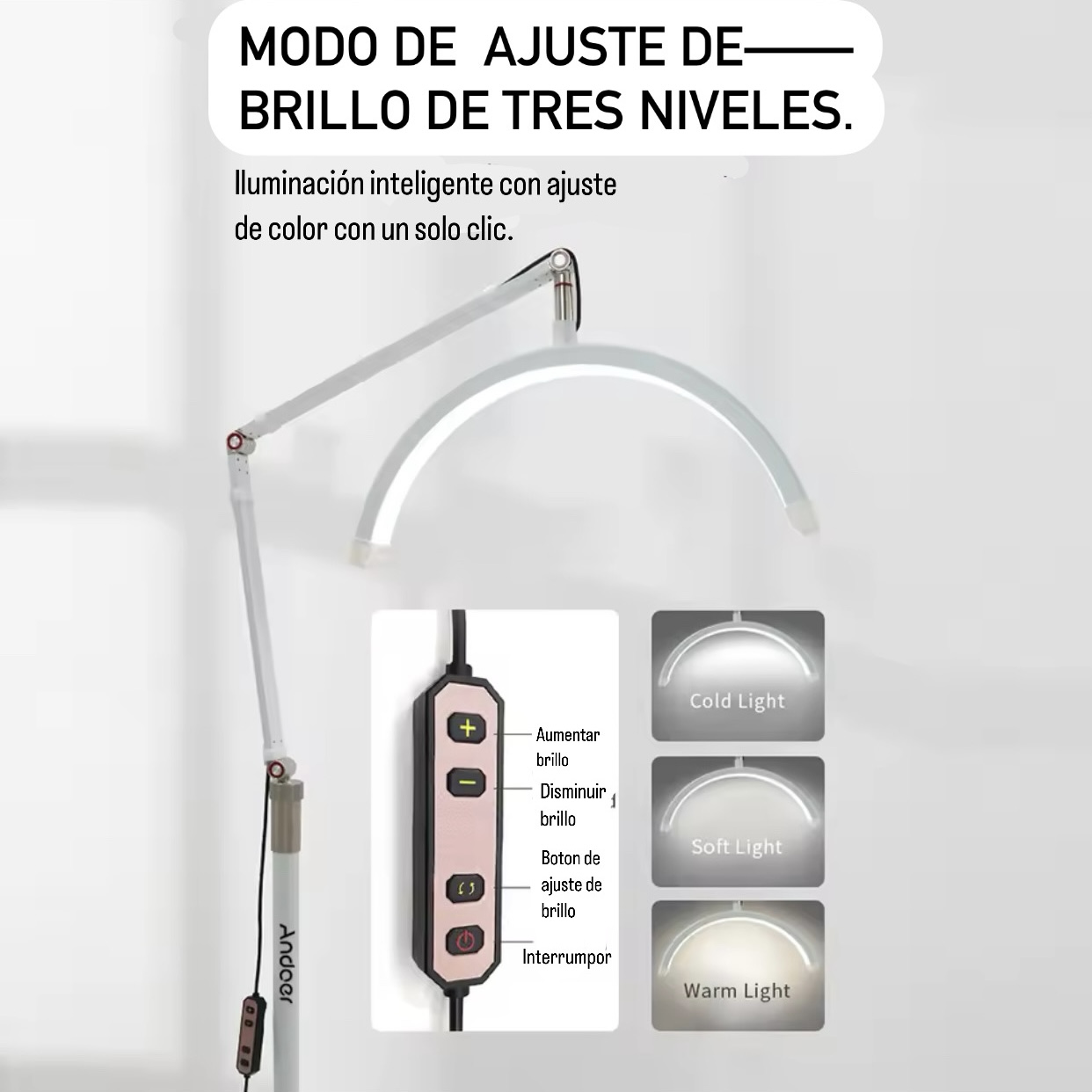 Diseño único de media luna con giro de 360º, la cabeza con forma de halo proporciona una amplia cobertura sin sombras, garantiza claridad a su obra de esteticista.